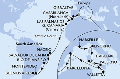 Francie, Itálie, Malta, Španělsko, Velká Británie, Maroko, Brazílie, Uruguay, Argentina z Marseille na lodi MSC Splendida