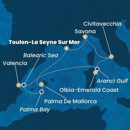 | 5. | 14.08.2026, Pá | 5. Golfo Aranci (Sardinie) / Itálie | 19:15 | 21:00 |