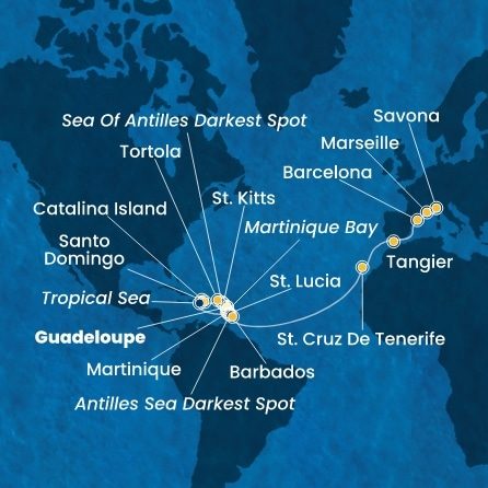 | 8. | 13.03.2026, Pá | 8. Pointe-à-Pitre (Guadeloupe) / Zámořský departement Francie | 08:00 | 21:30 |