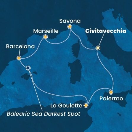 | 1. | 30.04.2027, Pá | 1. Civitavecchia / Itálie (nalodění) | --:-- | 19:00 |