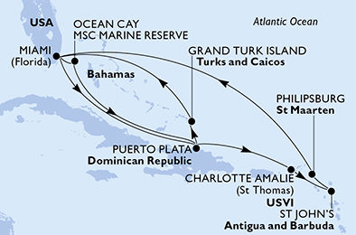 | 10. | 29.11.2027, Po | 10. Ocean Cay MSC Marine Reserve (Ocean Cay) / Bahamy | 08:00 | 23:59 |