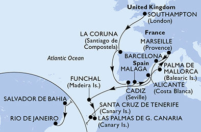 - Fakultativní výlety v navštívených přístavech. Lodní společnost má širokou nabídku výletů v každém přístavu, na vyžádání zašleme přehled. Výlety bývají v těchto jazycích: angličtina, španělština, italština, francouzština, němčina. Na plavbách s českým delegátem se konají výlety v češtině.