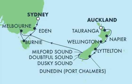 - Letecká doprava v Economy class z Prahy do Aucklandu a z Sydney do Prahy, transfery z letiště do hotelu a z hotelu do přístavu v Aucklandu, a z přístavu na hotel a z hotelu na letiště v Sydney. Na vyžádání je možné zajistit letenku z jiného letiště.