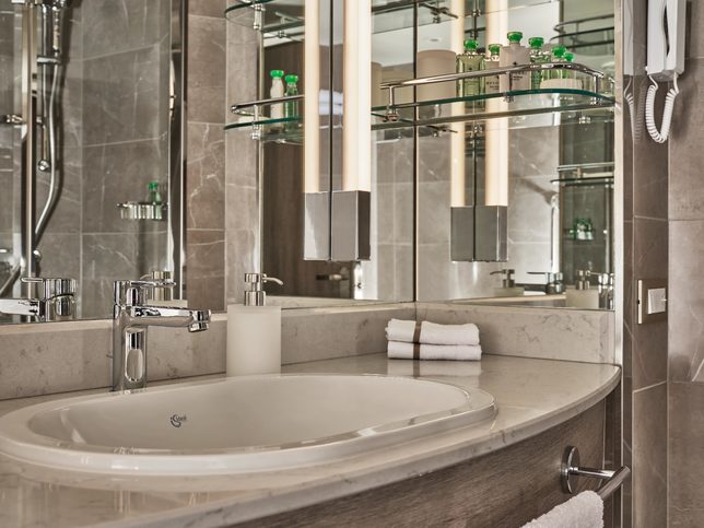 Dále je v apartmánech dostatek úložných prostor, šatna, dvoulůžko s nočními stolky, kvalitní matrací, ložním prádlem a výběrem polštářů, toaletní stolek se zrcadlem a koupelna se samostatnou vanou a sprchovým koutem - Silver, Royal, Grand a Owner´s Suite disponují i vířivou vanou. Samozřejmostí je dobře zásobený minibar dle preferencí hostů, trezor, telefon, fén, televize s plochou obrazovkou, župan, pantofle, dalekohled nebo deštník.