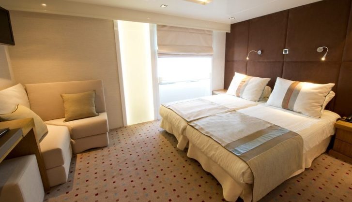 Největším na lodi je pak apartmá Owner´s Suite (1) situované na nejvyšší palubě s plochou 24 m2. Součástí jsou dvoje dvojitá okna, dvoulůžko, rozkládací pohovka, mramorová koupelna a další speciální vybavení.