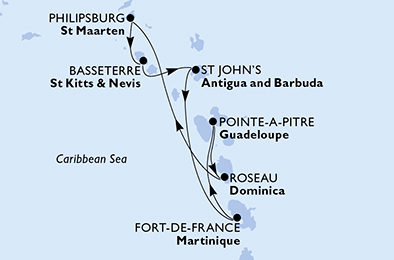 | 8. | 08.01.2028, So | 8. Fort-de-France (Martinik) / Zámořský departement Francie (vylodění) | 07:00 | --:-- |