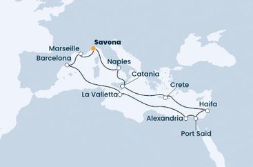 Itálie, Malta, Španělsko, Francie, Řecko, Kypr, Egypt, Omán, Katar, Spojené arabské emiráty z Neapole na lodi MSC World Europa