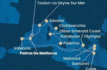 Austrálie, Papua Nová Guinea, Japonsko, Jižní Korea, Tchaj-wan, Čína, Vietnam, Singapur, Malajsie, Srí Lanka, Maledivy, Mauricius, Jihoafrická republika, Namibie, Kapverdy, Španělsko, Francie, Itálie ze Sydney na lodi Costa Deliziosa