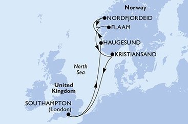Trasa: Velká Británie, Belgie, Norsko