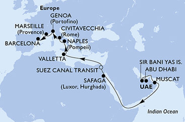 Spojené arabské emiráty, Omán, Egypt, Malta, Itálie, Francie z Dubaje na lodi MSC World Europa