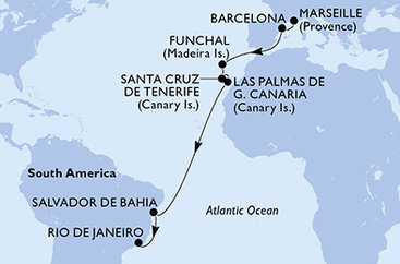 Francie, Španělsko, Portugalsko, Brazílie z Marseille na lodi MSC Virtuosa