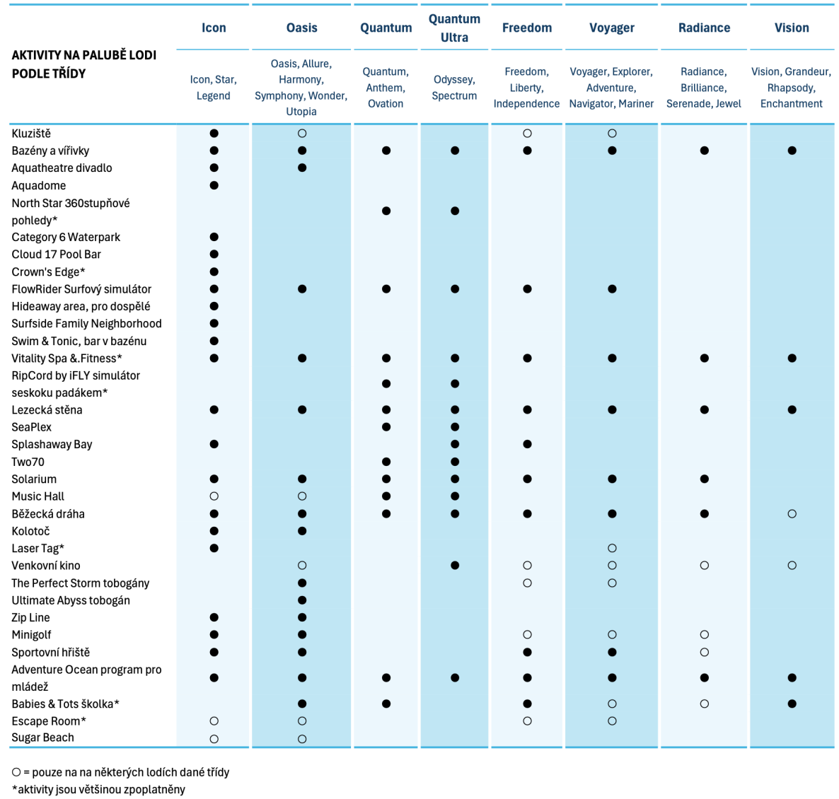 Orientační přehled aktivit na palubě najdete v tabulce níže: